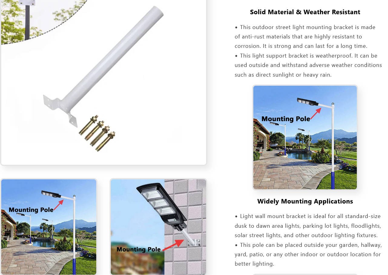 This street light pole mounting arm is made of high quality 304 stainless steel, strong and never rust, the street light mounting arm has a matte black powder coated finish. Designed to last up to 10 years without replacement, the stainless steel ensures durability and safety, avoiding falling on people or cars due to rust and corrosion of the bracket